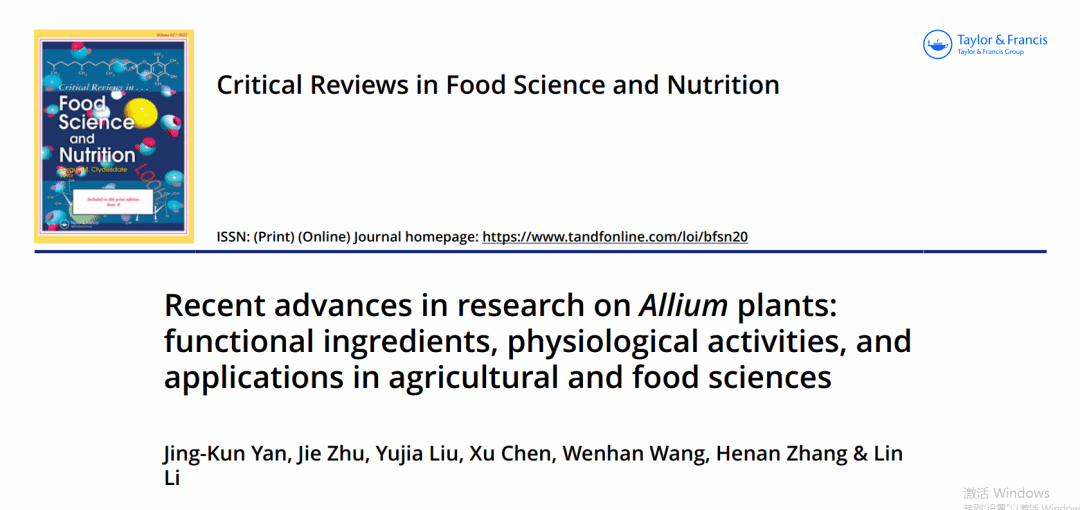 2022年3月,东莞理工学院化学工程与能源技术学院闫景坤教授(第一作者、通讯作者)在国际食品Top期刊《Critical Reviews in Food Science and Nutrition》(IF:11.208, 中科院一区)发表了题为“Recent advances in research on Allium plants: functional ingredients, physiological activities, and applications in agricultural and food sciences”的综述论文。