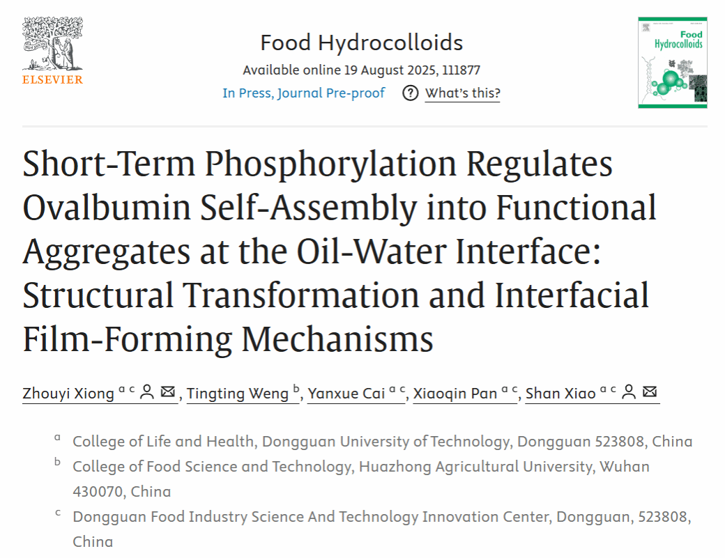 肖珊教授团队于国际食品顶级期刊《Food Hydrocolloids》(IF = 12.4)在线发表题为“Short-Term Phosphorylation Regulates Ovalbumin Self-Assembly into Functional Aggregates at the Oil-Water Interface: Structural Transformation and Interfacial Film-Forming Mechanisms”的研究性文章。论文第一作者为熊舟翼特聘副研究员,共同通讯作者为肖珊教授。