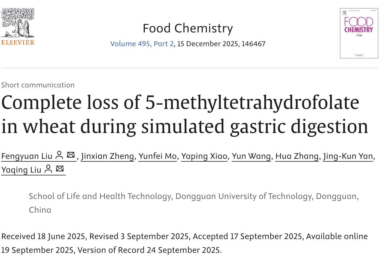 刘亚青教授团队于国际食品顶级期刊《Food Chemistry》(IF = 9.8)在线发表题为“Complete loss of 5-methyltetrahydrofolate in wheat during simulated gastric digestion”的快报研究性文章。雷速体育app
