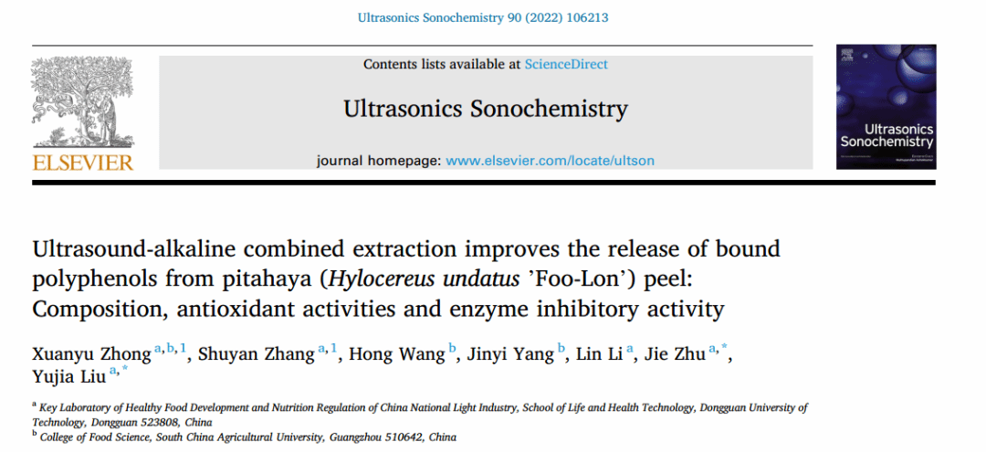 本研究以《Ultrasound-alkaline combined extraction improves the release of bound polyphenols from pitahaya (Hylocereus undatus ’Foo-Lon’) peel: Composition, antioxidant activities and enzyme inhibitory activity》为题发表在SCI收录期刊《Ultrasonics Sonochemistry》(IF2021= 9.34,1区TOP)。东莞理工学院-华南农业大学联合培养在读硕士钟烜钰为本文第一作者,该论文是我校雷速体育