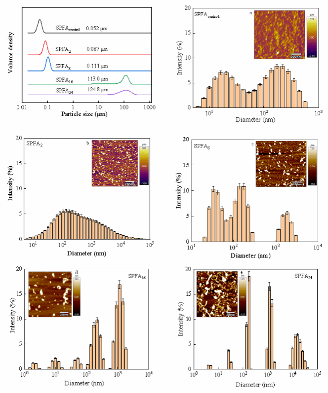 本研究通过在pH=2和不同加热时间条件下,诱导大豆分离蛋白自组装形成不同结构的纤维聚集体(SPFA),对SPFA的粒径分布、形貌特征和结构特性进行表征。系统研究了SPFA在“成核-聚集”过程中的聚集行为和在聚集过程中的结构变化规律,以及SPFA对马铃薯淀粉(PS)的结构、理化和消化性质的影响。