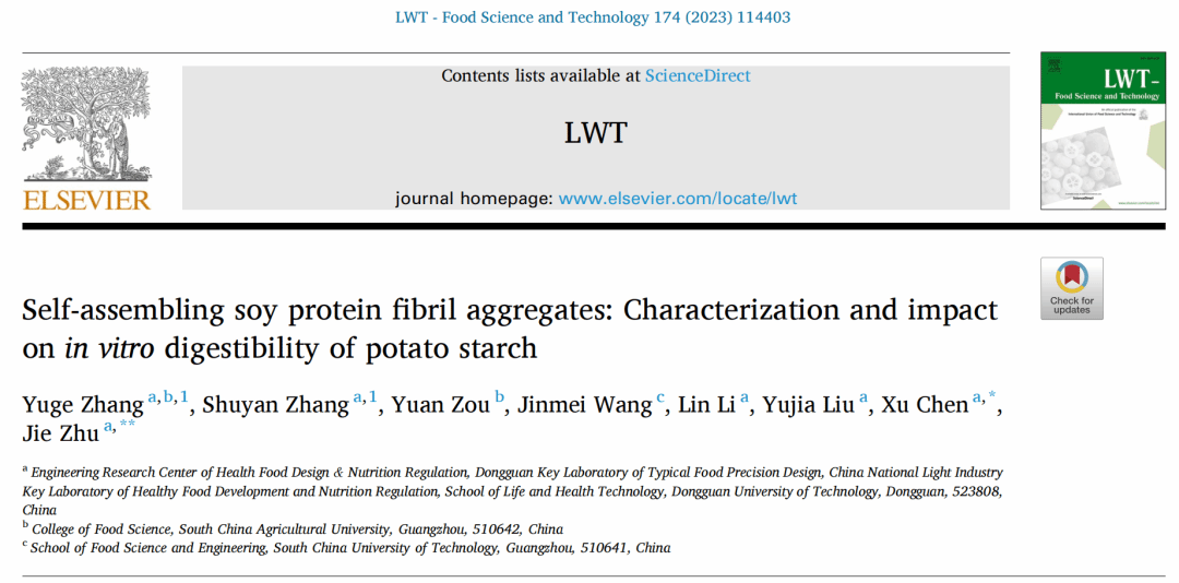 本研究以《Self-assembling soy protein fibril aggregates: Characterization and impact on in vitro digestibility of potato starch》为题发表在SCI收录期刊《LWT-Food Science and Technology》(IF: 6.056, Q1)。东莞理工学院-华南农业大学联合培养在读硕士张昱格为本文第一作者,雷速体育-雷速体育app