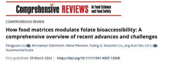 李琳教授团队在国际食品顶级期刊《Comprehensive Review of Food Science and Food Safety》在线发表题为“How food matrices modulate folate bioaccessibility: A comprehensive overview of recent advances and challenges”的综述文章。刘丰源助理研究员为论文第一作者,李琳教授为通讯作者。