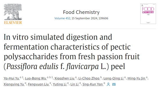 闫景坤教授团队于国际食品顶级期刊《Food Chemistry》在线发表题为“In vitro simulated digestion and fermentation characteristics of pectic polysaccharides from fresh passion fruit (Passiflora edulis f. flavicarpa L.) peel”的研究性文章。论文第一作者为于亚辉博士,通讯作者为闫景坤教授。