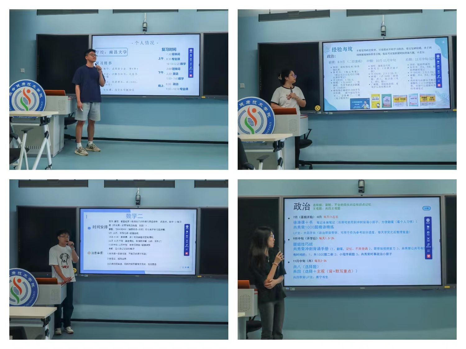 此次分享会邀请了陈少斌、马仁铭、龚佳鑫、林欣然4位2024届考研上岸同学介绍经验。他们分别考取暨南大学、南昌大学、汕头大学等国内知名院校。分享人从考研的心路历程、科目复习方法、时间规划技巧、心理调节建议等方面,分享了他们在考研过程中的心得体会和应对策略。他们的经验分享引起了在场学生的强烈共鸣,激发了同学们对考研的热情和信心。在分享后的互动环节,同学们踊跃提问,学长学姐耐心解答了每日计划制订、导师选择、面试准备等诸多与考研息息相关的问题。