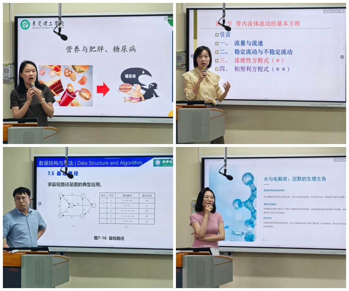 试讲环节中,蔡燕雪、李垄清、王洋、牛玉清四位教师依次登台授课。蔡燕雪通过形象展示各类饮料的含糖量,将抽象的营养知识具象化,同时让听众直观了解到过量摄入糖分的危害,兼具知识性与趣味性;李垄清创新结合动态图片与都江堰经典水利案例,将复杂的工程原理转化为通俗易懂的教学场景,帮助听众快速理解核心知识点;王洋以“如何计算最短路程”为切入点抛出问题,逐步引导听众探索最佳解决方法,层层递进、逻辑清晰,有效激发了大家的探究兴趣;牛玉清将营养素知识与常见医学问题紧密结合,打通理论知识和临床应用的关联。