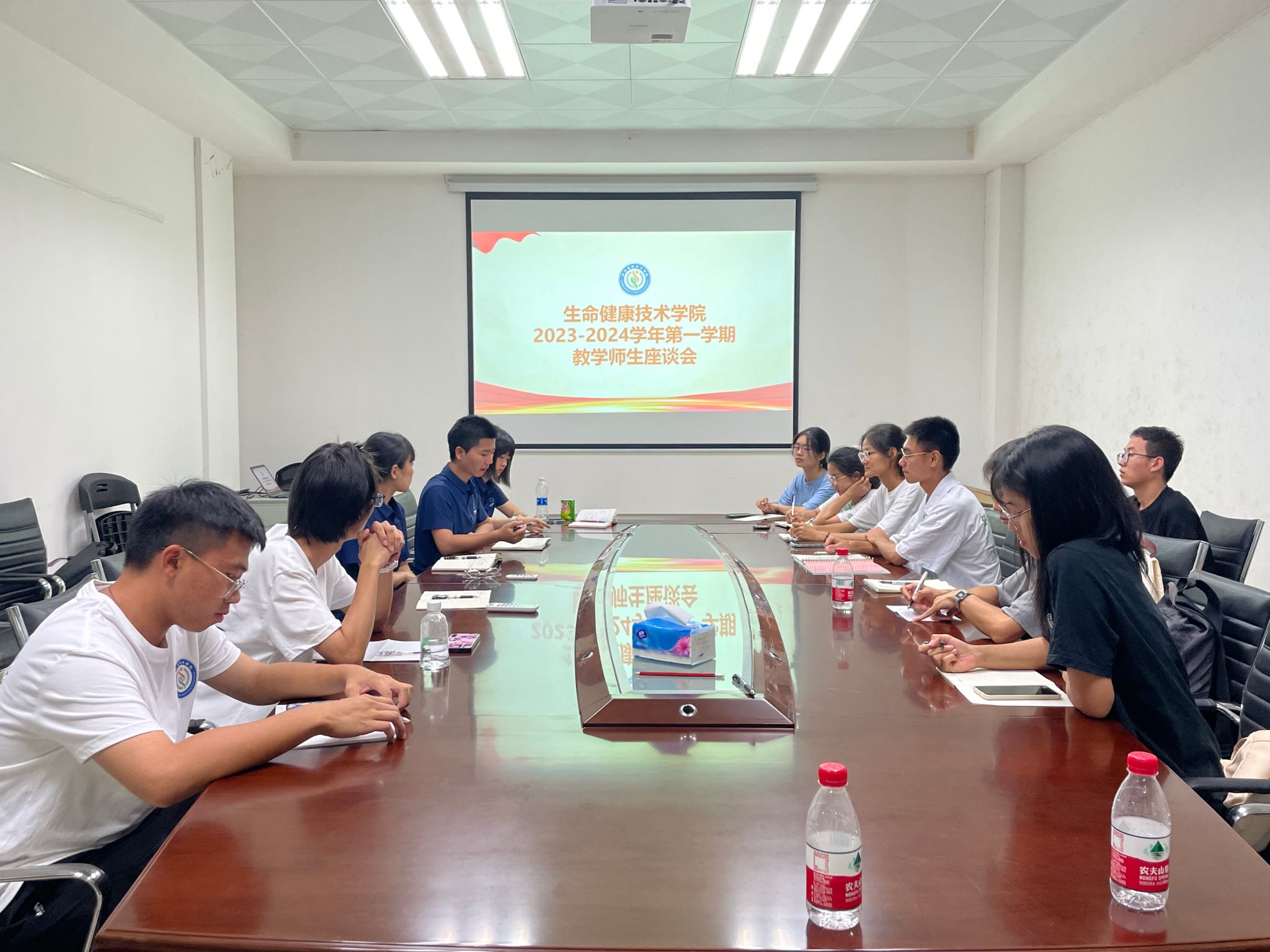 于学院会议室召开本学期师生座谈会。生物医学工程系主任王笛、营养与健康系副主任陈璇、青年教师代表刘梦和王梅梅与学院各专业、年级学生代表出席会议。