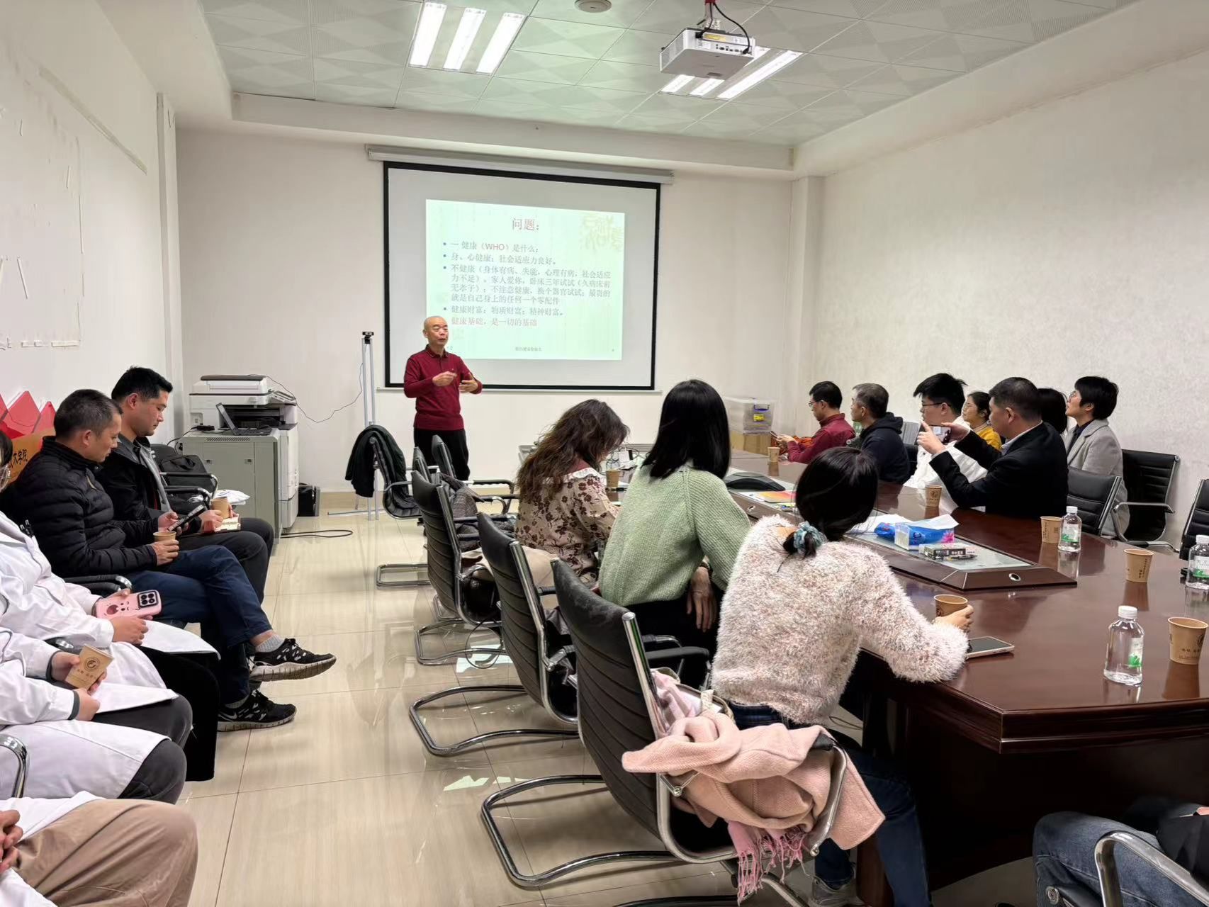 教职工提升健康意识、增强保健能力、缓解职业病困扰具有积极意义。随后,国医堂副主任医师陈煜辉为在场教职工带来了一场精彩的冬季中医养生讲座。他从中医理论出发,深入浅出地讲解了冬季养生的核心原则和实用方法,强调顺应自然规律、科学调养身体的重要性。通过生动的案例分享,陈主任不仅让教职工们对中医养生有了更深刻的理解,也激发了大家对传统医学的浓厚兴趣。
