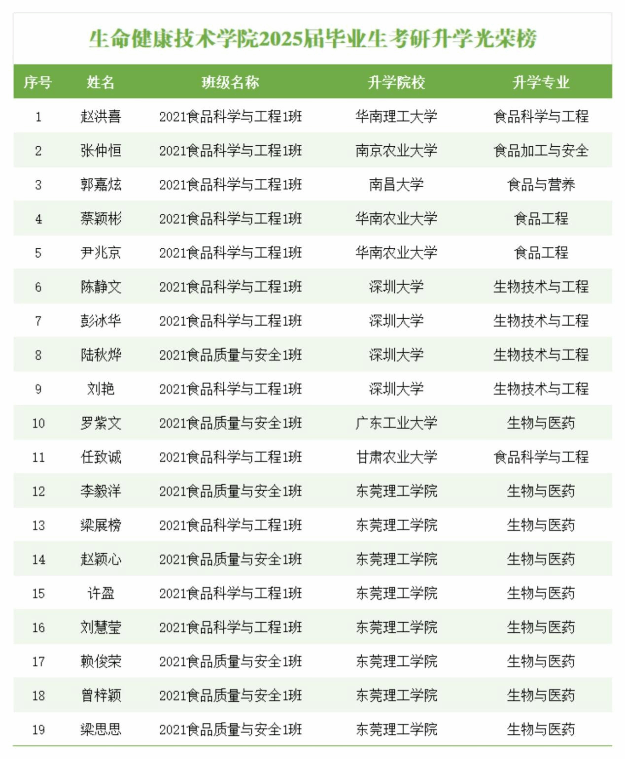 考研学子捷报频传,19名毕业生成功考取硕士研究生,升学率达31.15%,创历年新高。其中多名学子被华南理工大学、南京农业大学、南昌大学、华南农业大学等省内外知名学府录取。